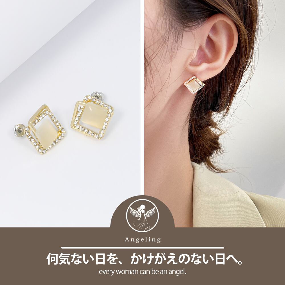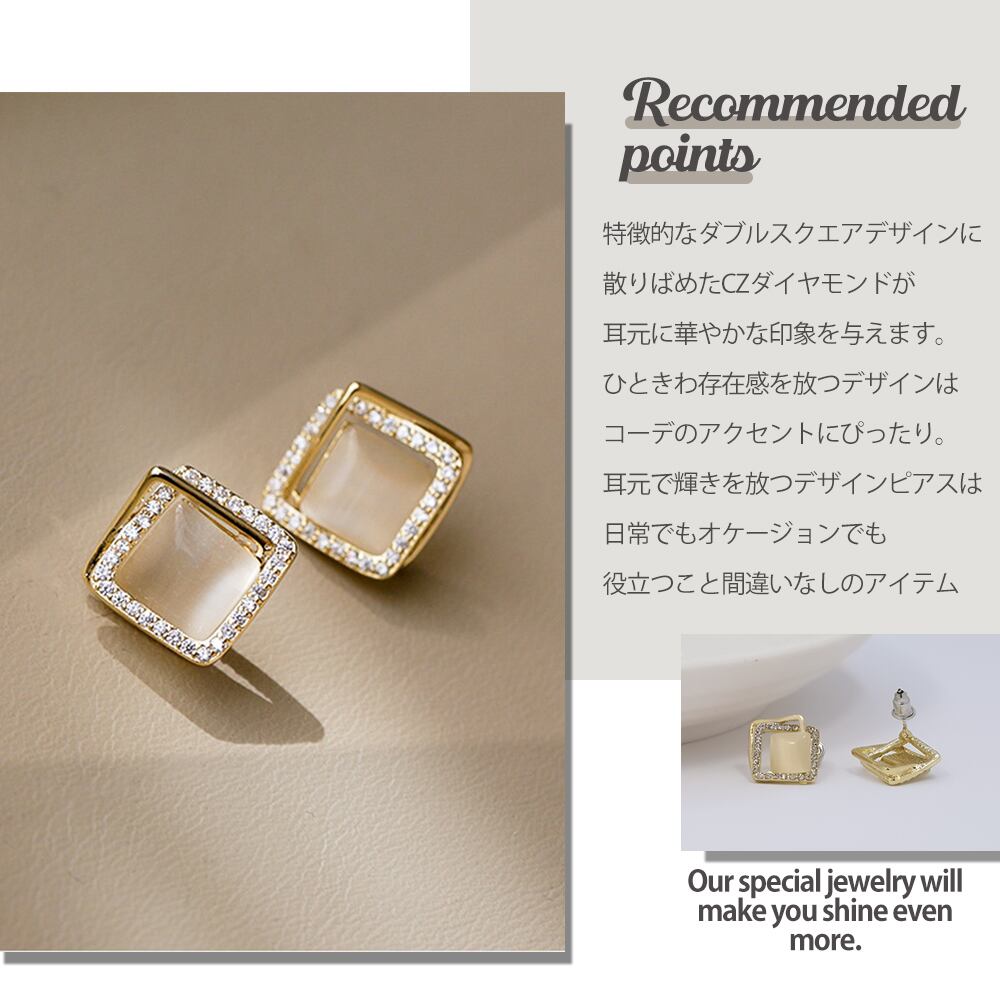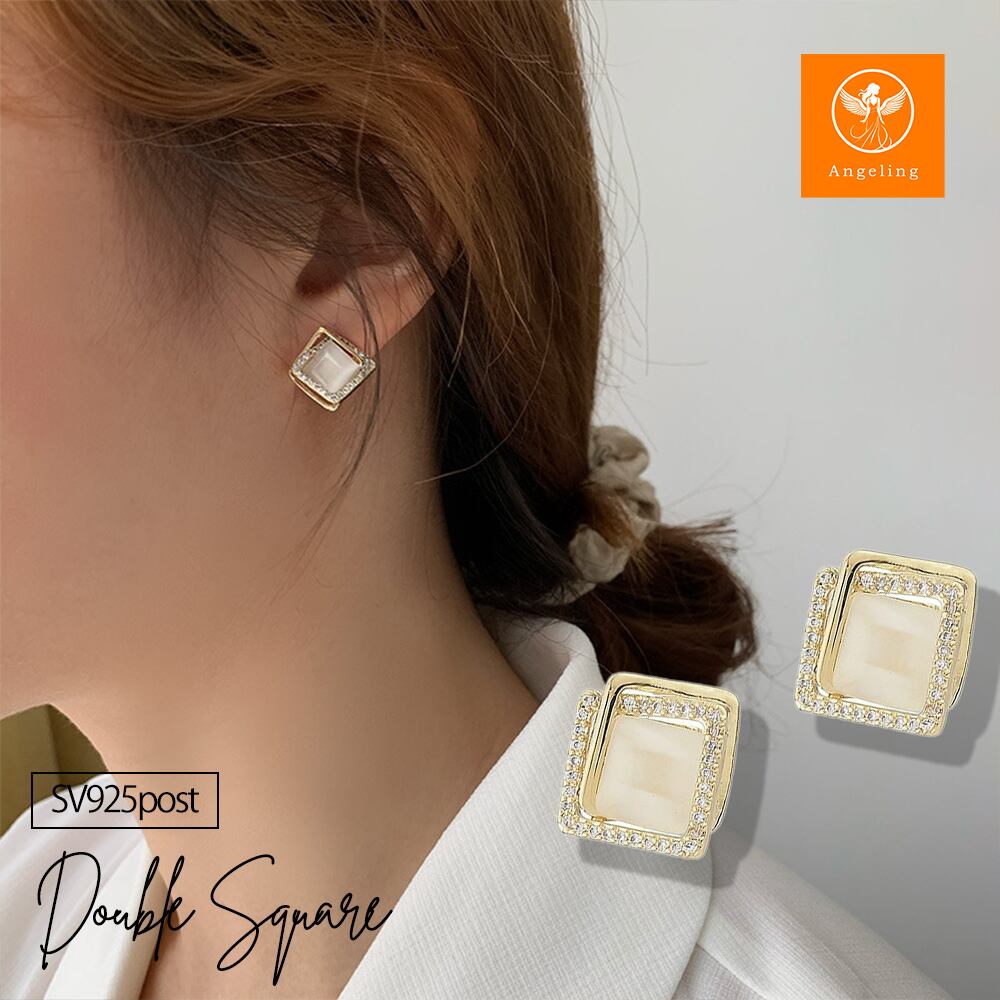 ピアス レディース スクエア ダブルスクエア シンプル ゴールド デザインピアス 愛され ピアス CZダイヤモンド SV925ポスト K18コーティング ブランド ピアス 誕生日 プレゼント 金属アレルギー | Angeling