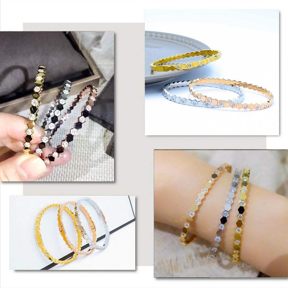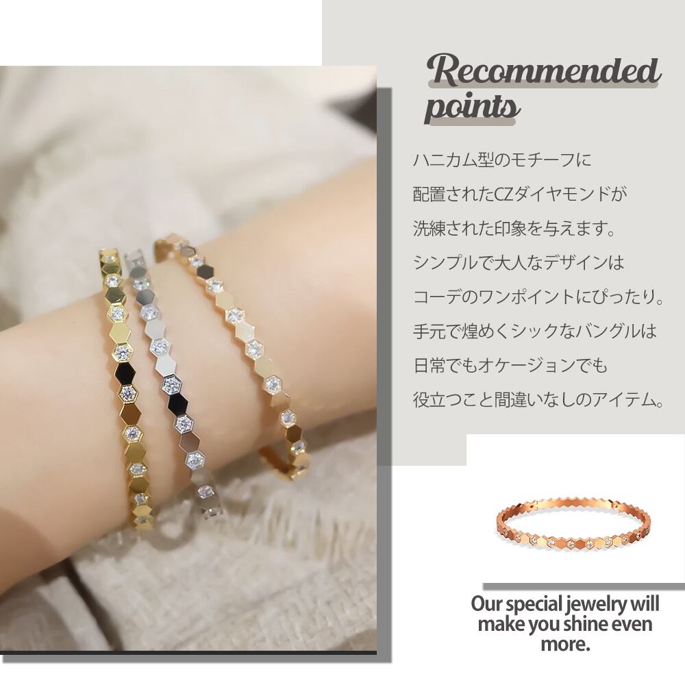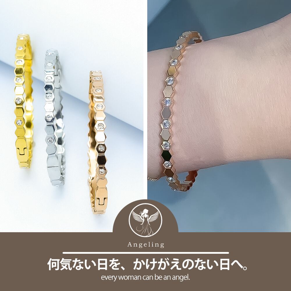 ブレスレット ハニカム型 ハニカムブレスレット 六角形 ゴールド シルバー ピンクゴールド ダイヤモンド CZ 金属アレルギー対応 サージカルステンレス製 ファッション 高見え プチプラ 高見え | Angeling